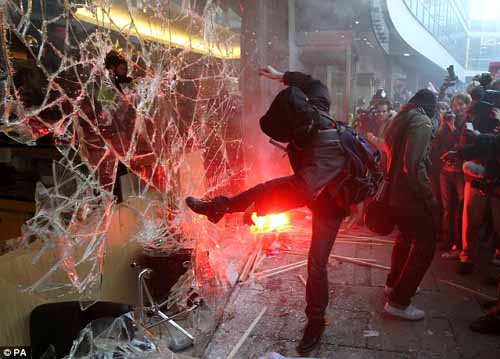 行為過(guò)激的好斗分子將一些參加示威游行的學(xué)生帶入瘋狂失控狀態(tài)。他們襲擊警察,并破壞了保守黨總部所在的大樓。