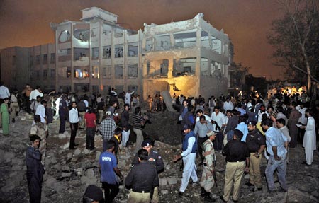 報道援引目擊者的描述稱,疑似激進(jìn)分子先向這個建筑開槍,然后引爆汽車炸彈,將卡拉奇刑事偵查局辦公室的總部夷為平地。至少有90人在爆炸中受傷,電視畫面顯示救援人員把受害者從廢墟中救出來。