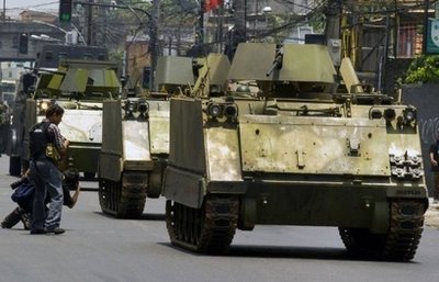 最少10輛配備點(diǎn)50口徑機(jī)關(guān)槍的“M113”裝甲車,隆隆駛過里約熱內(nèi)盧市中心街頭,長(zhǎng)驅(qū)直進(jìn)開往該市北面的克魯賽羅貧民窟。當(dāng)局從來未試過出動(dòng)這種重裝備對(duì)付毒販,今次十足打仗一樣,許多居民都嚇了一跳。