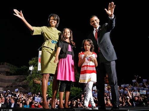 奧巴馬一家人站在艾奧瓦州講臺(tái)上,感謝選民熱情支持。