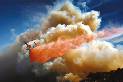 滅火飛機在山火地區(qū)投擲阻燃劑。