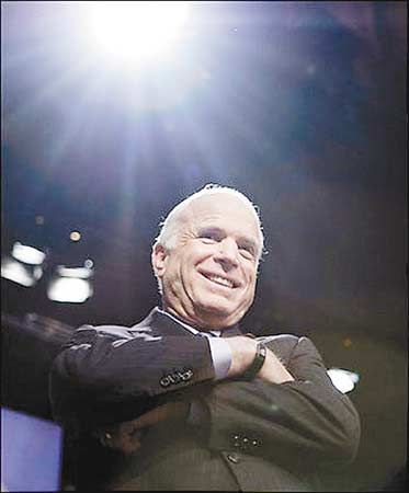 在外交和軍事政策領(lǐng)域的比拼中,古稀之年的麥凱恩顯然要比少年得志的奧巴馬老練得多。出身將門的麥凱恩可謂身經(jīng)百戰(zhàn),其作為戰(zhàn)俘在越南監(jiān)獄中度過(guò)5個(gè)春秋的傳奇經(jīng)歷更使其愛(ài)國(guó)精神無(wú)人能敵。麥凱恩一方面充分利用這些有利條件把自己塑造成美國(guó)民眾足可信賴的政治家和總司令,另一方面持續(xù)攻擊奧巴馬缺乏外交和軍事經(jīng)驗(yàn)的弱點(diǎn)。
