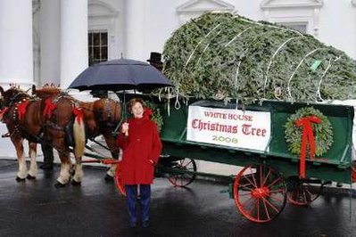 美國(guó)“第一夫人”勞拉30日在白宮門(mén)前冒雨迎接圣誕樹(shù),這已經(jīng)是她第8次亦是最后一次以白宮主人身份主持簡(jiǎn)單的接受儀式。她的丈夫喬治-布什即將卸任總統(tǒng),之后兩人便會(huì)告別白宮。