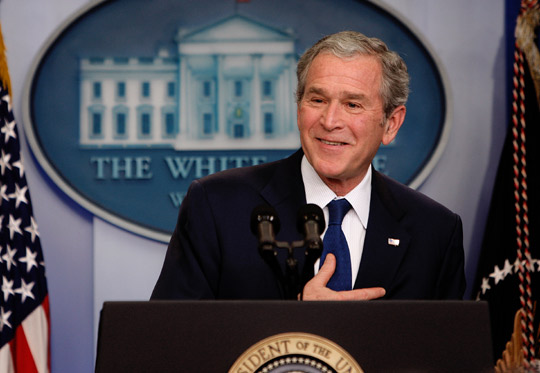 習(xí)慣為別人取外號(hào)的布什在一開(kāi)始就稱今天的記者會(huì)為“最終臨別采訪”,并對(duì)八年來(lái)一直在白宮報(bào)道他的白宮常駐記者們表達(dá)了充分的感謝。布什積極評(píng)價(jià)白宮新聞處八年來(lái)的工作及角色。在布什兩個(gè)總統(tǒng)任期內(nèi),白宮新聞秘書多次更換,令人記憶猶新的是,去年的美國(guó)總統(tǒng)大選期間,布什的前任白宮新聞秘書麥克萊倫公開(kāi)出書,抨擊布什在伊拉克戰(zhàn)爭(zhēng)中撒謊。當(dāng)然,這位牛仔風(fēng)格的總統(tǒng)在受到媒體批評(píng)之后有時(shí)候也會(huì)在這個(gè)位于白宮橢圓辦公室西側(cè)的新聞發(fā)布廳表達(dá)自己的憤怒和發(fā)發(fā)牢騷。