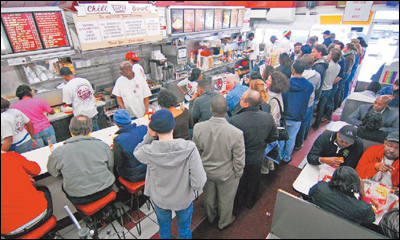 據(jù)《華盛頓時(shí)報(bào)》3月1日?qǐng)?bào)道,U街是華盛頓最大的黑人社區(qū),也是全美國(guó)歷史最悠久的非洲裔社區(qū)。自從美國(guó)總統(tǒng)奧巴馬和華盛頓市長(zhǎng)阿德里安·芬蒂1月10日品嘗了這里“班氏餐館”的“半支香煙”(半截豬肉半截牛肉)熱狗后,這里的熱狗銷量一下子增加了兩倍,人們不得不排隊(duì)等候。