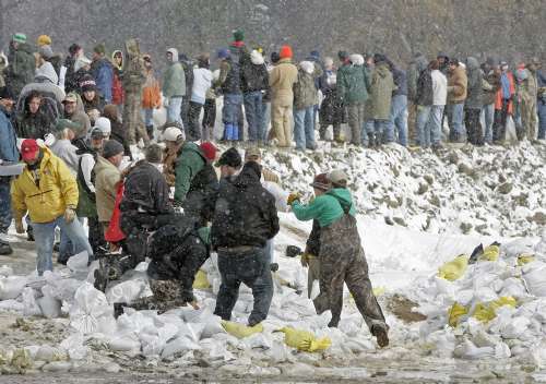 在27日早上,法戈市大約150戶居民已經(jīng)撤離,一些醫(yī)院、診所和學(xué)校也關(guān)閉,而數(shù)千名志愿人員及1700名國民警衛(wèi)軍冒寒堆放沙包,加固城市周邊的防洪帶,并準(zhǔn)備在防御物發(fā)現(xiàn)裂縫后作出通報。另外,在明尼蘇達州穆爾黑德市,約2660戶居民要緊急疏散。法戈市市長瓦拉克說,他們正在集中力量,全力搶救能夠保護的每件財產(chǎn)。法戈變成澤國的風(fēng)險十分高,因為該市未有發(fā)展上游區(qū)域城市的周延大型防洪系統(tǒng)。另外,北達科他州政府亦用炸藥炸開堵塞的冰塊,以疏通受阻而淹沒該州的洪水,并出動救難艇和直升機救出受困在各地的災(zāi)民。