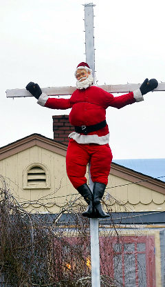 中新網(wǎng)12月24日電 美國華盛頓布萊摩頓居民康洛德最近對圣誕節(jié)彌漫的“消費主義”十分反感,他的反感已經(jīng)不僅僅體現(xiàn)在避開購物中心和關(guān)掉電視這么簡單了,而是將圣誕老人釘在自家房前15英尺高的十字架上。