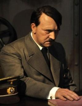 這尊蠟像塑造的是蘇聯(lián)紅軍兵臨城下后希特勒在自殺前的最后時(shí)刻。與其他蠟像不同的是,表情垂喪的希特勒坐在一張桌子后面(見圖)。蠟像館的人這樣安排,其用意是防止有人與希特勒蠟像合影,或者毀壞蠟像。