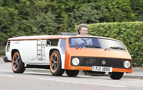 這輛露營(yíng)車(chē)被命名為“敞篷蛋糕(Van-Cake)”,時(shí)速最高可達(dá)128公里/小時(shí)。桑德斯的團(tuán)隊(duì)將原有大眾車(chē)1.38米高的頂棚切割掉,改裝成了一個(gè)35厘米高的頂棚。他們?cè)谲?chē)內(nèi)放入新的操縱系統(tǒng)和低矮的座位。受制于空間,這輛車(chē)不是使用腳剎,取而代之的是手動(dòng)剎車(chē)和變速桿;燃料槽也是經(jīng)過(guò)特別制作的。目前已經(jīng)取得合法上路的資格。由于這輛車(chē)非常矮,它可以輕松地從停車(chē)場(chǎng)柵欄下通過(guò)。