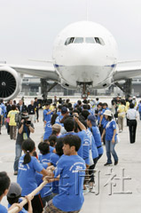家長們加入進(jìn)來后機(jī)體才稍稍移動了數(shù)米,大家頓時擊掌歡呼。來自千葉市的小學(xué)二年級學(xué)生堀江昌大(8歲)睜大眼睛說,“手很痛,看到飛機(jī)真的動了大吃一驚”。