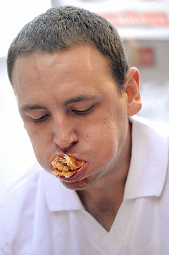 在O七年的美國國慶吃熱狗大賽中,切斯納特擊敗了連續(xù)多屆奪魁的日本著名“大胃王”小林尊,登上“大胃王”寶座。今年國慶,他又在十分鐘內(nèi)吃下五十九只熱狗,衛(wèi)冕成功。