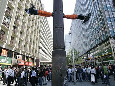 中新網(wǎng)10月16日電 綜合報(bào)道,智利魔術(shù)師Jean Paul Olaverry和Nicolas Luisetti以能使人漂浮在空中的魔術(shù)聞名。15日他們?cè)谥抢锥际サ貋喐缃诸^再次展現(xiàn)拿手好戲,他們輕松的站上電線桿的兩側(cè)。