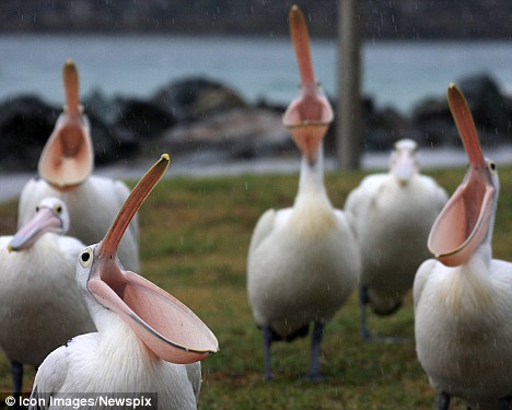 澳洲數(shù)只鵜鶘同時(shí)張開喙接雨水
