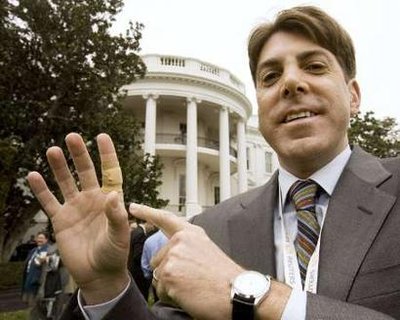 路透社記者德克伸出被美國(guó)總統(tǒng)布什的愛犬巴尼咬了一口的食指。