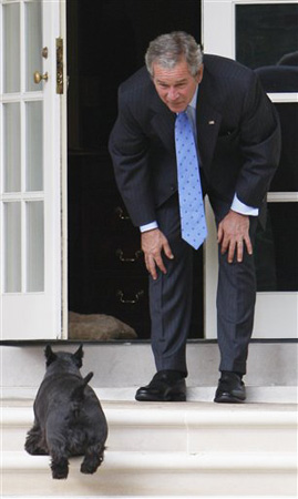 2007年9月28日,美國(guó)總統(tǒng)布什結(jié)束國(guó)務(wù)院的會(huì)議后,在白宮與他的小狗巴尼嬉戲。