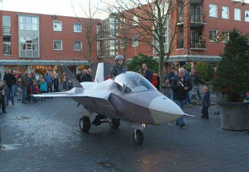 這架仿造的戰(zhàn)斗機(jī)機(jī)身長(zhǎng)7米、寬4米,設(shè)計(jì)者是根據(jù)F-35聯(lián)合攻擊戰(zhàn)斗機(jī)以1:2的尺寸制作而成的,所有花費(fèi)共計(jì)4000英鎊。來(lái)自荷蘭的亞瑟是這架戰(zhàn)斗機(jī)的設(shè)計(jì)者,他全部的制作材料是鋼材、木頭、硬泡沫、玻璃纖維以及大量的環(huán)氧裝填物。亞瑟在戰(zhàn)斗機(jī)的座艙內(nèi)安裝了照相機(jī)、監(jiān)控器;為適應(yīng)晚間飛行的需要,還裝備了導(dǎo)航燈、探照燈、內(nèi)部照明設(shè)備等。戰(zhàn)斗機(jī)飛行的最快速度為8公里/小時(shí)。