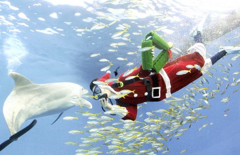 扮成圣誕老人的潛水員水族箱內(nèi)喂白鯨