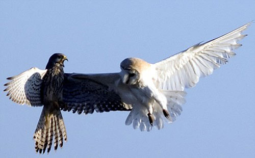 “能看到這一幕真的非常不可思議。谷倉貓頭鷹堅(jiān)持不懈的尋找野鼠一類的食物,但每次總會(huì)遭到茶隼的襲擊! 據(jù)攝影師介紹:“它們在空中展開激烈搏斗,最終貓頭鷹會(huì)選擇放棄,并丟下自己的獵物逃跑,但貓頭鷹還會(huì)再回來。這種戰(zhàn)斗會(huì)進(jìn)行好幾次,直到茶隼吃飽喝足,貓頭鷹才能安心享用自己所捕到的食物。”