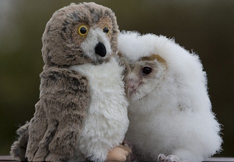 據(jù)英國(guó)《每日郵報(bào)》報(bào)道,一只僅有數(shù)周大的谷倉(cāng)貓頭鷹孤兒與一個(gè)貓頭鷹填充玩具成了好朋友。