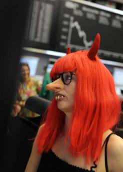 中新網(wǎng)2月27日電 據(jù)路透社報道,德國一年一度的杜塞爾多夫狂歡節(jié)日前達到高潮,但DAX股指卻于23日當(dāng)天降至2004年10月底以來的最低點,不過這并未妨礙金融業(yè)者加入狂歡的盛宴。日前,他們在沉悶的證交所里開起化妝舞會。交易員們秀絲襪美腿,化妝搞怪。