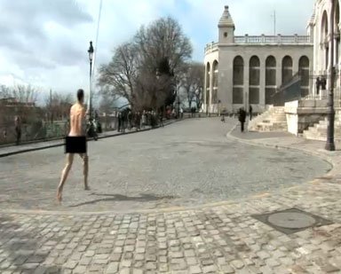 他在寒冷的氣溫中裸體握住撐竿,有節(jié)奏的助跑,還穿越塞納-馬恩省河上的藝術大橋,所經(jīng)過的地方都立刻吸引路人目光。