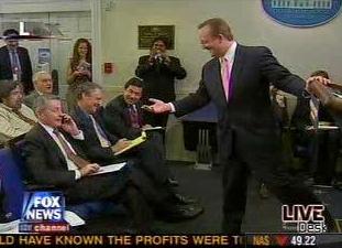 三家主要的有線電視臺都實況轉播了白宮新聞發(fā)布會!度耸隆冯s志記者約翰-吉茲的手機首先傳出鈴聲。吉布斯在聽到鈴聲后稱:“請放至震動,我們以前也是這樣作的!碑斒謾C再次發(fā)出聲音后,吉布斯走下講臺,要求吉茲交出手機,他隨后把手機扔給站在房間后面的一位助手。就在吉布斯回到講臺,開始回答一個問題時,美國哥倫比亞廣播公司記者比爾-普朗特的手機又響了起來。已負責報道白宮事務25年的普朗特拒絕了吉布斯交出手機的要求,他離開了房間,人們發(fā)出一陣笑聲,普朗特五分鐘后回到他的前排座位。