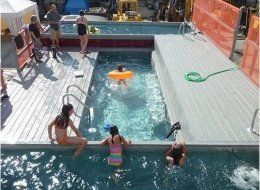 據(jù)臺灣《中國時(shí)報(bào)》報(bào)道,這座游泳池位在紐約市布魯克林區(qū)歌瓦努斯運(yùn)河河畔,共有三個(gè)池子,全是由垃圾收集箱改造而成,泳池旁邊有一片平臺,放著幾張海灘椅和烤肉架,還附設(shè)一個(gè)淋浴間。從7月4日開幕以來,已經(jīng)舉辦過烤肉、電影試映和攝影等活動,許多紐約藝文界人士趨之若鶩。