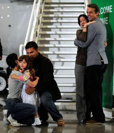 李承恩與丈夫邁克爾-薩爾達(dá)杰和四歲女兒漢納擁抱時(shí),流下喜悅的眼淚。凌志美與丈夫伊恩-克萊頓擁抱,其它家人則擠在他們周圍,激動(dòng)得流淚。