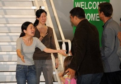 三十二歲的凌志美、三十六歲的李承恩(前譯李尤娜)與克林頓所乘坐的飛機(jī)在洛杉磯附近的伯班克機(jī)場(chǎng)降落,兩名女記者下機(jī)時(shí),激動(dòng)得泣不成聲。