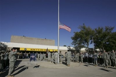 奧巴馬并下令即日起到11日退伍軍人節(jié)為止,白宮和其它聯(lián)邦機(jī)構(gòu)降半旗向受難者致哀。他說,這是對(duì)那些正準(zhǔn)備為國家冒生命危險(xiǎn)卻喪命的人的最起碼敬意。