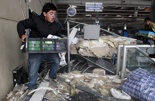 在智利第二大城市康塞普西翁,很多超市、藥店、加油站都受到哄搶。2月28日,當?shù)仉娨暸_拍下驚心動魄的一幕:來自四面八方的人們涌向損毀的超市,見什么搶什么,除了生活必需品,甚至連電視等家用電器都被搬走;一名男子手持搶來的幾卷衛(wèi)生紙茫然地站在超市門口。