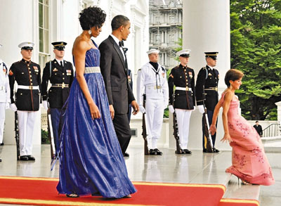 中新網(wǎng)5月21日電 據(jù)香港《文匯報(bào)》報(bào)道,美國(guó)總統(tǒng)奧巴馬19日在白宮設(shè)宴款待來(lái)訪(fǎng)的墨西哥總統(tǒng)時(shí)發(fā)生一段小插曲,白宮的禮儀官準(zhǔn)備迎接貴賓時(shí),忽然跌一跤,整個(gè)人坐在階梯上,受驚的她立刻站起來(lái),開(kāi)玩笑警告攝影記者不要拍照。