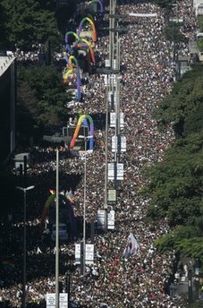 中新網(wǎng)6月7日電 據(jù)外電報道,巴西城市圣保羅周日(6日)舉行一年一度的同性戀大游行,組織者稱這是世界上規(guī)模最大的此類游行。