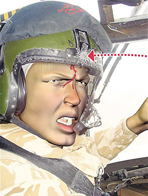 當時塔利班分子的攻勢很激烈,直升機盤旋良久才逮到一個交火較少的機會降落下來,不過當傷員陸續(xù)登上直升機時,對手的襲擊又開始活躍起來。當傷員接載完畢,伊恩冒著彈雨再起飛時,一粒子彈剛巧擊中他的頭盔前部一塊用于安裝夜視鏡的金屬架,子彈從這里穿透了頭盔,射中他的眉心。鮮血從伊恩的額頭涌了出來,一直流到他的眼睛。此時更多的子彈射了進來,支奴干的控制臺被擊中,穩(wěn)定系統(tǒng)無法工作。但伊恩仍然努力控制直升機,繼續(xù)飛行了大約8分鐘,順利降落基地?哲娤⑷耸空f,如果子彈射低一毫米,又欠缺這位機師的駕駛技術,機上所有人相信無機會生還。