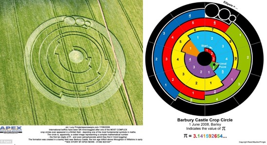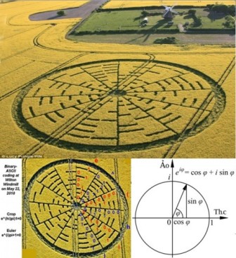 然而,有些麥田怪圈的圖案復(fù)雜性驚人。著名麥田怪圈女學(xué)者露西.普林格爾強(qiáng)烈懷疑,穆爾伯勒市的麥田怪圈象征著二進(jìn)制之類的數(shù)系,數(shù)學(xué)家指出,由圓心向外去看,這個(gè)圖案呈現(xiàn)著由瑞士數(shù)學(xué)家萊昂哈德-歐拉被視為“最美麗的數(shù)學(xué)定理之一”的e^(i)p+1=0。