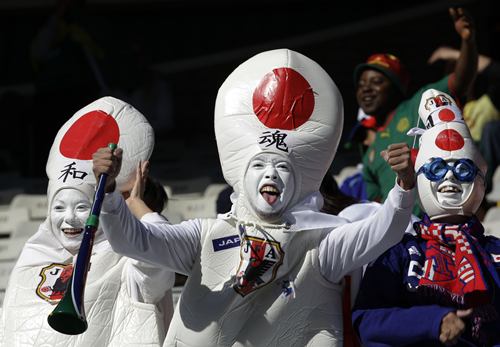 中新網6月22日電 據(jù)臺灣“東森新聞網”22日報道,南非世界杯開幕后小組賽如火如荼地進行,除了場上拼搶的各國球員,為球員們加油助威的各國女球迷無疑也成為賽場邊一道吸引人眼球的風景線。不過,除了網絡走紅的美女球迷,更夸張的是日本裝扮奇特的女球迷,活像一個個保齡球瓶,又像“安全套”。