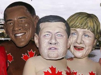 來自加拿大樂施會組織的幾名成員裝扮成八國首腦,他們帶上奧巴馬、默克爾等領(lǐng)導(dǎo)人的面具,身穿肉色緊身衣,看上去仿佛“赤身裸體”,而關(guān)鍵部位則用一片加拿大特有的紅葉遮羞。他們在鏡頭前搔首弄姿、大擺pose,欲以此嘲諷G8峰會。