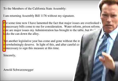 然而,施瓦辛格的過(guò)人“幽默感”與反擊方式不僅止步于此。他在否決這項(xiàng)法案的特別咨文中,竟以“藏頭詩(shī)”的方式狠狠羞辱了政敵阿米阿諾。從信的正文第二自然段起,將每行左邊第一個(gè)字母挑出來(lái),豎著念,就能拼成兩個(gè)單詞,而這兩個(gè)單詞可謂是全球最廣為人知、也堪稱美國(guó)“國(guó)罵”的不雅詞匯。可見這位曾經(jīng)對(duì)著萬(wàn)千觀眾大秀肌肉的好萊塢猛男玩起文字游戲來(lái),一點(diǎn)也不含糊。
