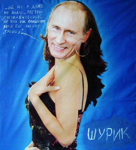 普京一向以“硬漢”形象示人,如今一個(gè)心懷不滿的畫(huà)家,竟然將這個(gè)“硬漢”畫(huà)成一個(gè)身穿低胸吊帶緊身裙,擁有一頭波浪長(zhǎng)發(fā),并戴著大耳環(huán)的女人。這名畫(huà)家已經(jīng)被俄羅斯秘密警察拘捕。對(duì)于自己涉嫌羞辱總理的行為,該畫(huà)家解釋說(shuō)自己是對(duì)普京還想當(dāng)總統(tǒng)一事表示抗議。