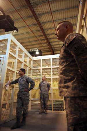 目前,巴格拉姆基地多數(shù)的恐怖疑犯都被囚于一個帳篷拘留所中,但在本月內(nèi)將會有六百四十名囚犯得以遷往環(huán)境較佳的帕爾旺拘留所。掌管這座“新關(guān)塔那摩”的美軍律師馬克.馬丁斯指,關(guān)塔那摩灣監(jiān)獄和伊拉克的阿布格里卜監(jiān)獄都被指違反法律,但帕爾旺拘留所將會被視為一座合理對待囚犯的監(jiān)獄,因?yàn)樗鼘肿袷胤ㄖ魏秃侠沓绦虻膬纱笤瓌t,并將致力協(xié)助囚犯在出獄后重新融入社會。他說這是美國在對待恐怖疑犯上的“真正進(jìn)步”,而監(jiān)獄的運(yùn)作將會具有透明度。