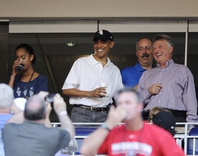 據(jù)報(bào)道,美國總統(tǒng)奧巴馬當(dāng)晚身穿白色短袖T恤,頭戴白襪隊(duì)球帽。除了第一女兒薩莎和馬莉婭,白宮高級(jí)顧問阿克塞爾羅德和奧巴馬的華人妹夫吳加儒亦有同行,在一個(gè)私人包廂觀看賽事。