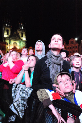 數(shù)千名球迷23日晚上聚集在布拉格市中心老城廣場觀看球賽的電視實(shí)況轉(zhuǎn)播,捷克隊(duì)最終取勝后人們一片歡騰。(黃頻)