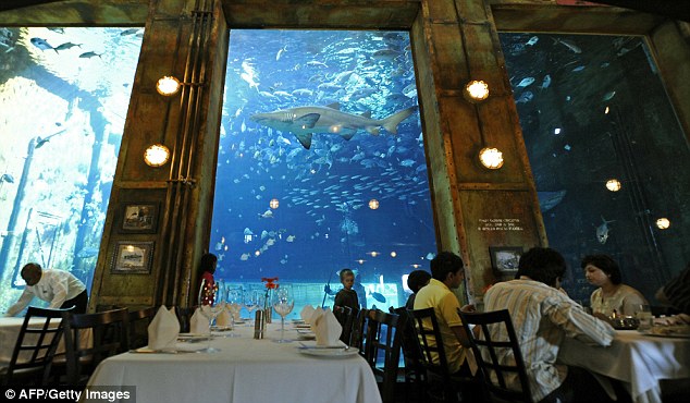 當你在船尾這家涼爽昏暗的角落,大嚼著生猛海鮮,這家海洋樂園著名的鯊魚,會從你就餐的窗戶外遨游而過。