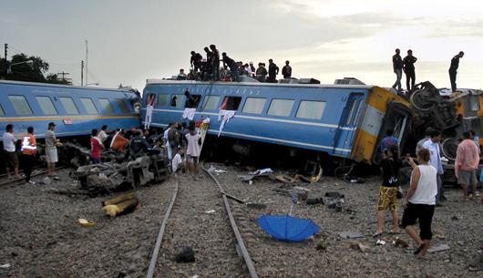 據(jù)此間泰國民族網(wǎng)站報道,事故今天早上四點四十五分發(fā)生在華欣縣的號陶站,事故發(fā)生時,這輛有十六節(jié)車廂的火車至少有六個車廂出軌,并當(dāng)場造成七名女旅客死亡,逾百名旅客受傷。