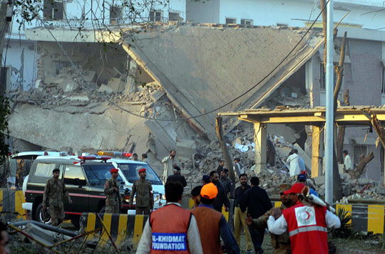 目擊者稱,現(xiàn)場(chǎng)升起巨大的濃煙,到處都是殘磚碎瓦。大樓前部和中部全部倒塌。巴基斯坦軍方發(fā)言人表示,這是一起自殺式汽車炸彈襲擊。相關(guān)人員正在廢墟搜尋是否有人被埋在下面。美聯(lián)社消息稱有35人受傷。