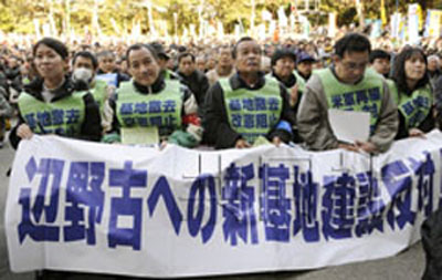 現(xiàn)行計劃中的搬遷地點、沖繩縣名護(hù)市新當(dāng)選的市長稻嶺進(jìn)也向集會發(fā)來了表達(dá)共同愿望的信息。市民團(tuán)體“直升機(jī)基地反對協(xié)議會”的共同代表安次富浩表示:“鳩山由紀(jì)夫首相說將把名護(hù)市長選舉的結(jié)果作為判斷材料,我們?nèi)〉昧藙倮。沒有比這更能代表民意的了!