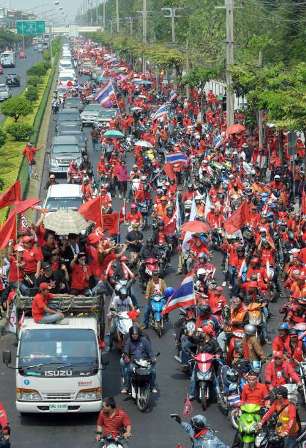 第一波示威活動(dòng)于12日傍晚結(jié)束。紅衫軍13日將重新集結(jié),前往皇家田廣場等主要集會場所,附近是熱門旅游景點(diǎn)大皇宮及玉佛寺。東北部和北部各省的上萬紅衫軍支持者昨天也開始向曼谷出發(fā),將于周日抵達(dá)。
