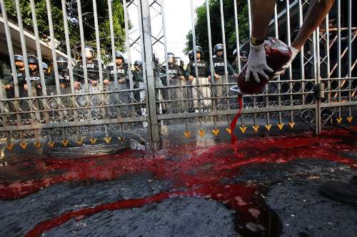 防暴警察讓部分紅衫軍代表提著數(shù)桶鮮血進入鐵閘。他們在眾人的歡呼聲中,穿過鐵甲威龍般的軍警隊列,行至總理府正面的鐵門前。在媒體的鏡頭前,紅衫軍代表們將鮮血傾倒在那里。