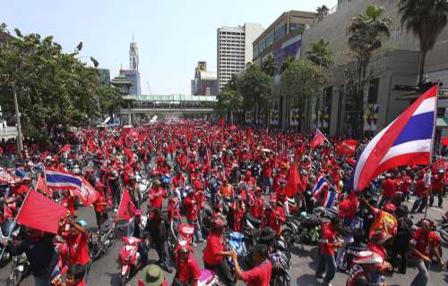 紅衫軍在旅游熱點(diǎn)四面佛附近架起講臺(tái)集會(huì),他們站滿馬路、天橋和百貨公司前的廣場(chǎng),領(lǐng)袖揚(yáng)言徹夜示威,直至重新大選。