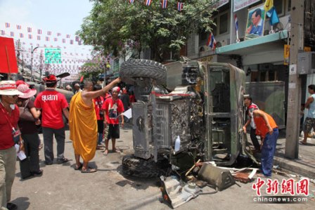 泰國10日晚的血腥沖突造成至少21人喪生,874人受傷。這是自從1992年有48人在一次反軍方抗議中被殺以來,曼谷最嚴重的暴力行為。傳媒透露,下令驅散“紅衫軍”的是陸軍第二把交椅、陸軍副司令帕拉育,他還表示會承擔一切后果。暴力沖突后,軍隊撤后以示節(jié)制,并且要求“紅衫軍”也后退,因此11日深夜,曼谷出現(xiàn)一種非正式的;馉顟B(tài)。